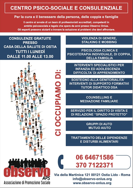 L’evento, organizzato dal Municipio Roma X , in collaborazione con il Cdq Lido Centro, si è svolto con la preziosa partecipazione: delle realtà associative del territorio tra cui noi Observo aps, che operiamo sul territorio per la tutela dei diritti delle donne e contro ogni forma di violenza con uno sportello di ascolto gratuito, il lunedi dalle ore 11:00 alle 13:00 presso la Casa della Salute. Si riceve per appuntamento previo contatto: 370 712 2371 / 328 082 4947.